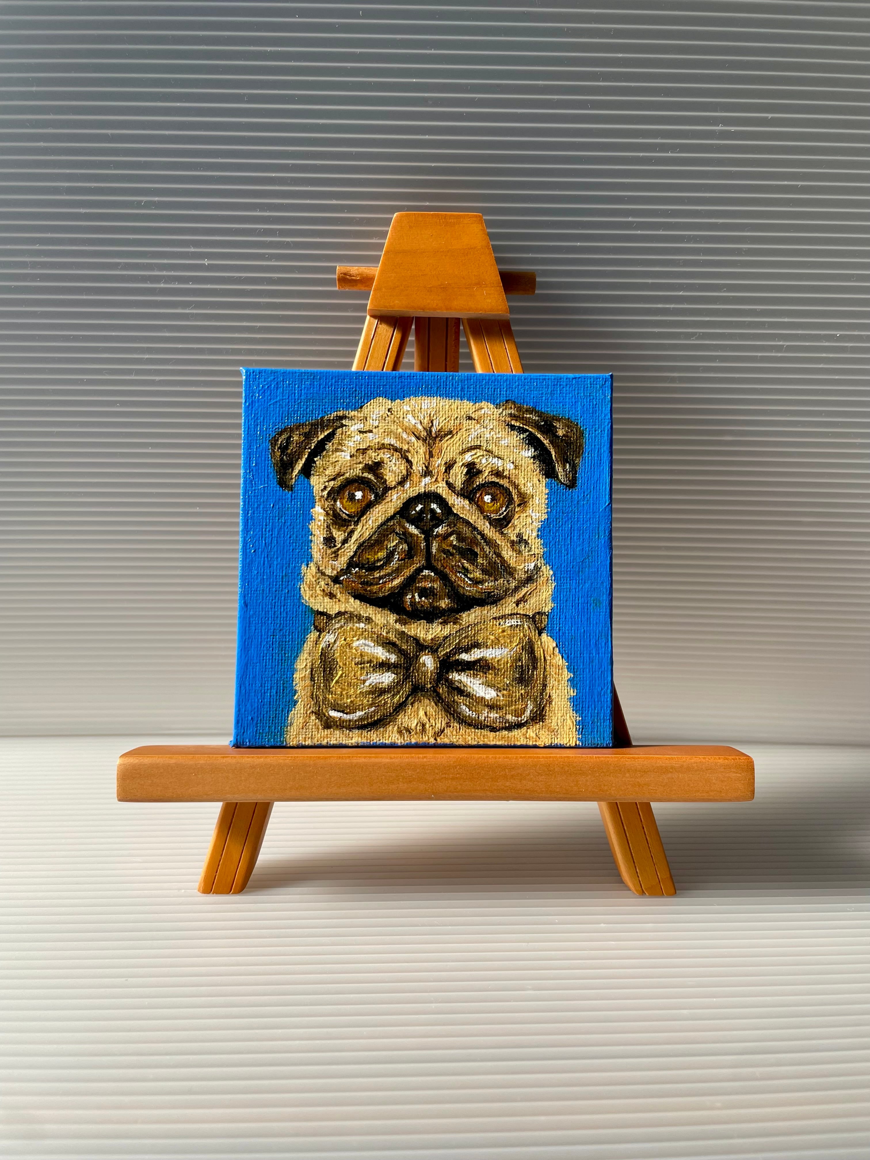 小さなキャンバスに、金色の蝶ネクタイをつけたパグを描きました。