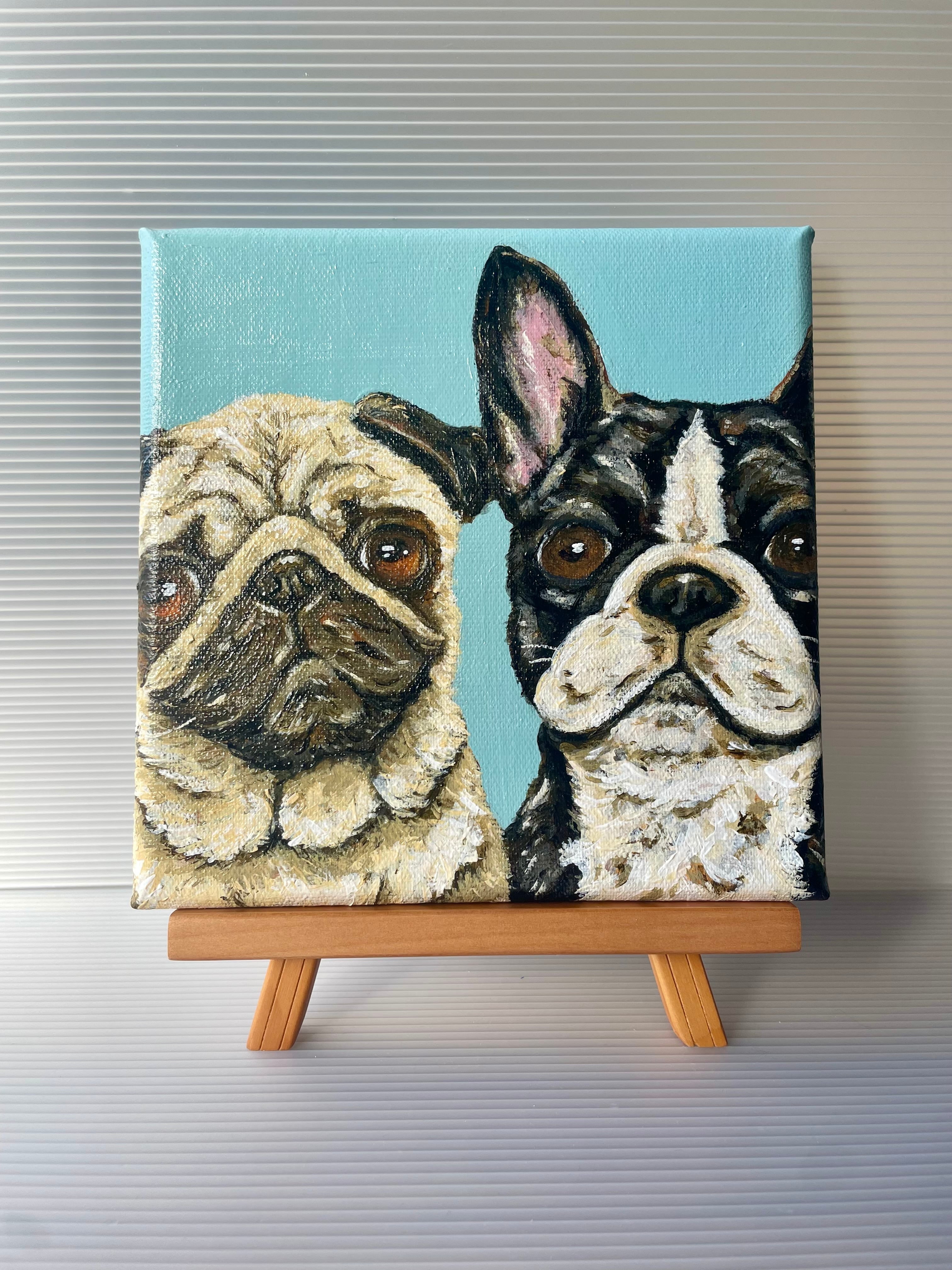 パグとフレンチブルドッグが、仲良く並んでこちらを見つめる姿を描いたアクリル原画作品です。