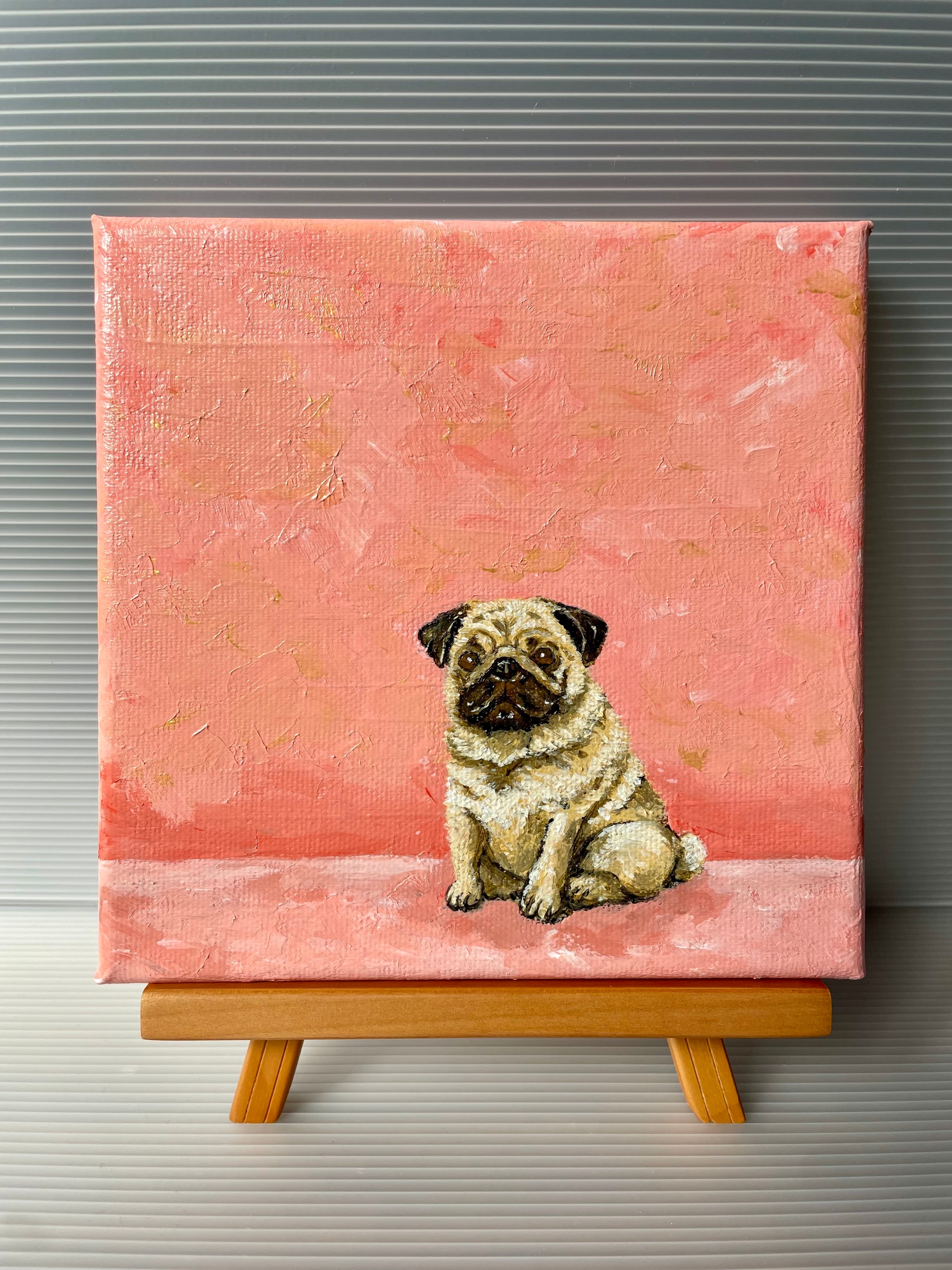 あたたかなピンクの背景の中に、ちょこんと座るパグを描いたアクリル原画作品です。