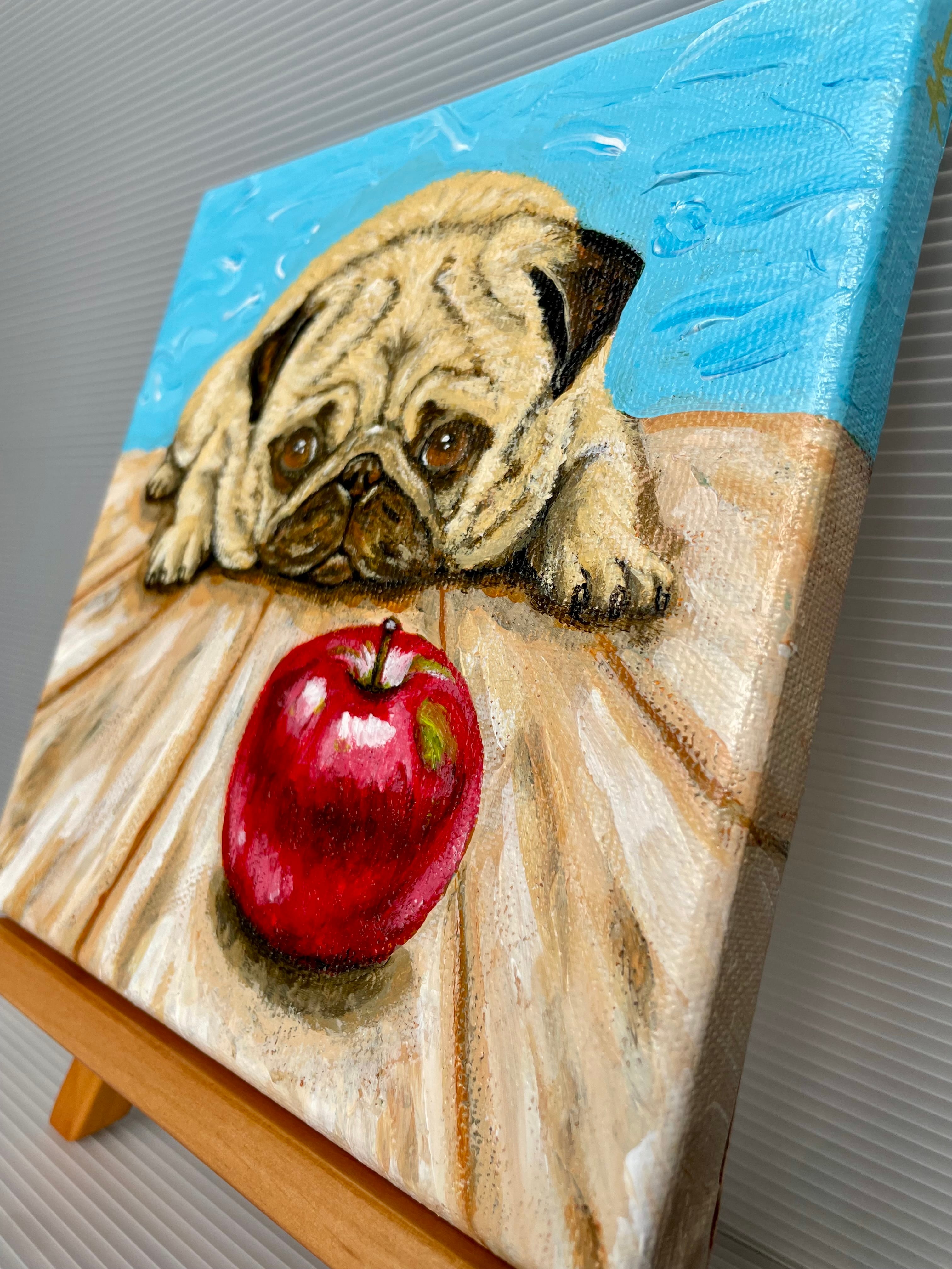 りんごをじっと見つめるパグをアクリル絵の具で描きました。
