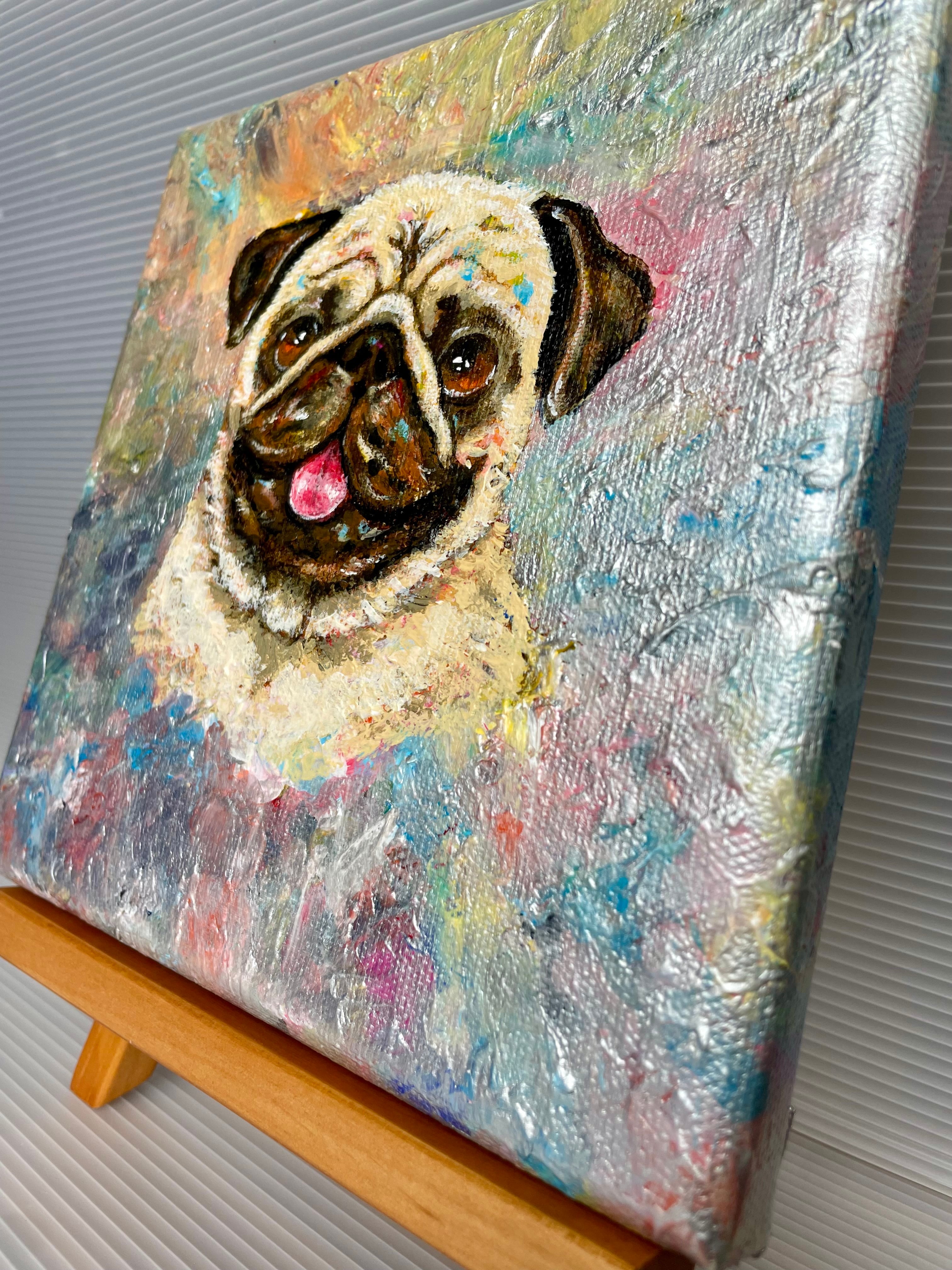シルバーの輝きをまとい、やさしく微笑むパグをアクリル絵の具で描きました。
