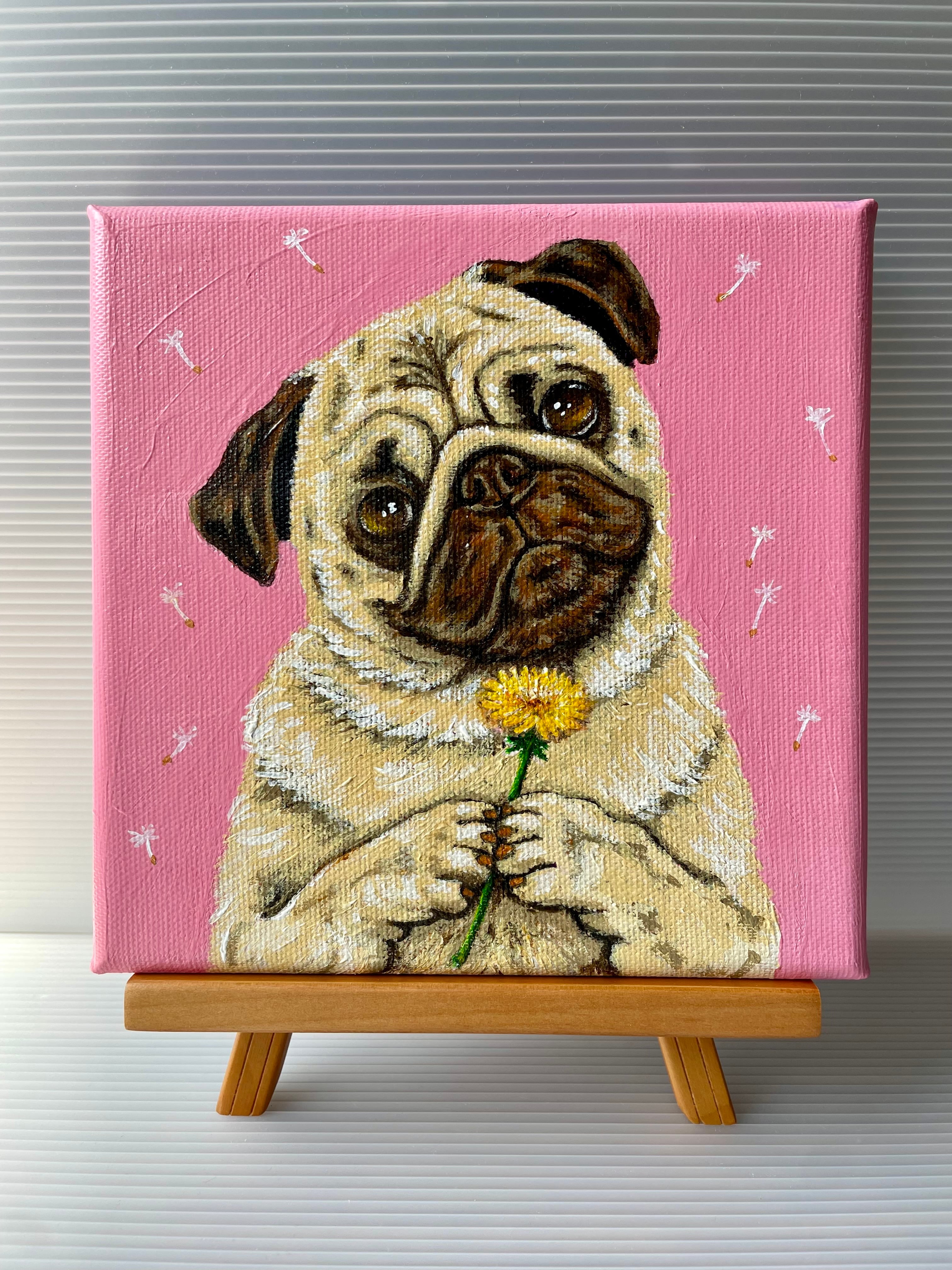 やわらかなピンクの背景に、そっとたんぽぽを抱えるパグをアクリル絵の具で描きました。