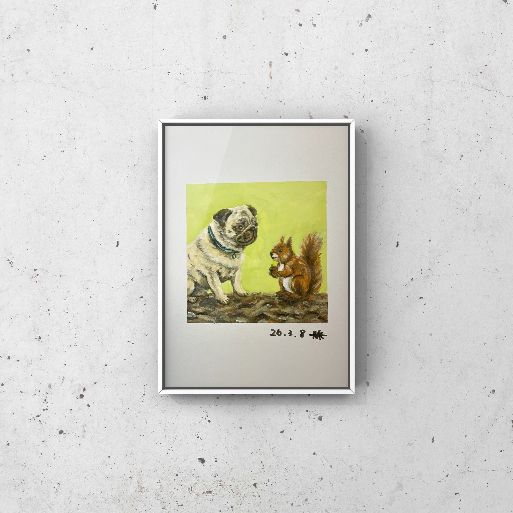 静かな緑に包まれた中で、リスとパグの出会いをアクリル絵の具で描きました。