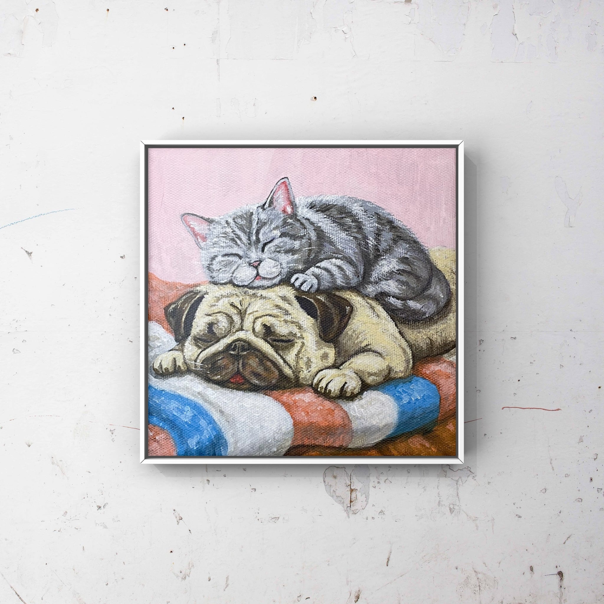 ふんわりとしたクッションの上で眠るパグと、そのぬくもりに包まれるように、安心しきった表情で寄り添うネコをアクリル絵の具で描きました。