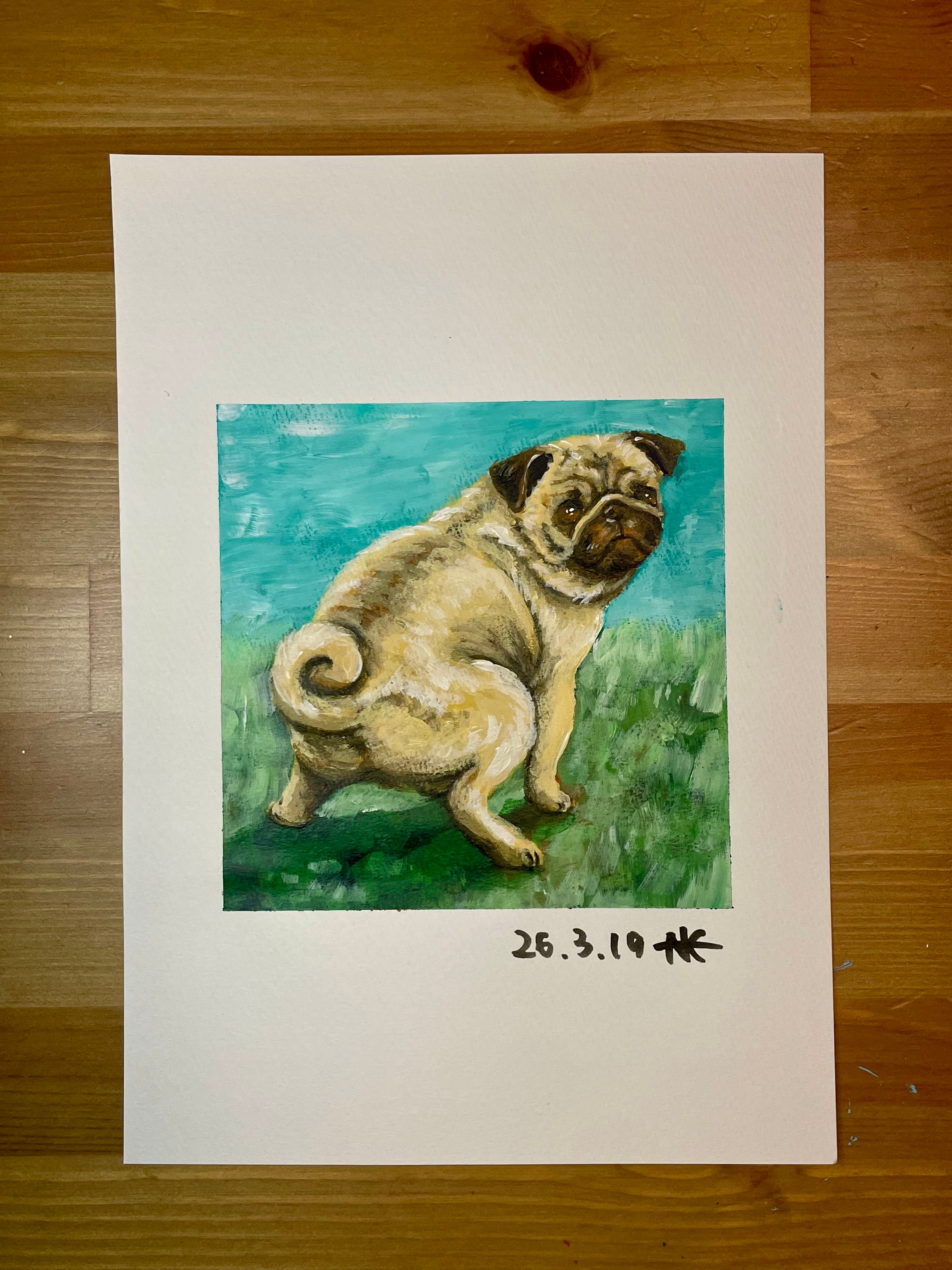 思わず二度見してしまう、なんとも言えない瞬間を切り取ったパグをアクリル絵の具で描きました。