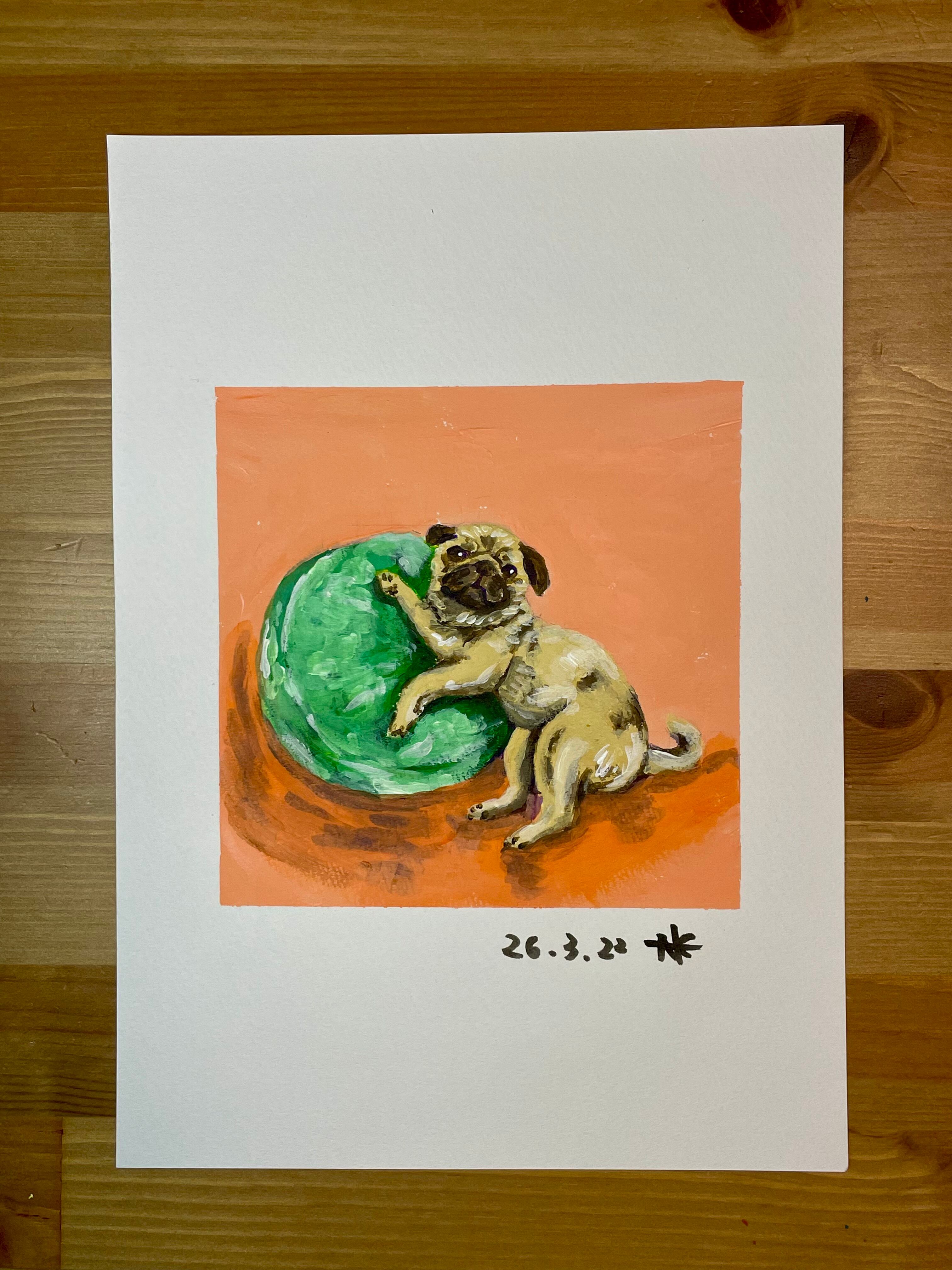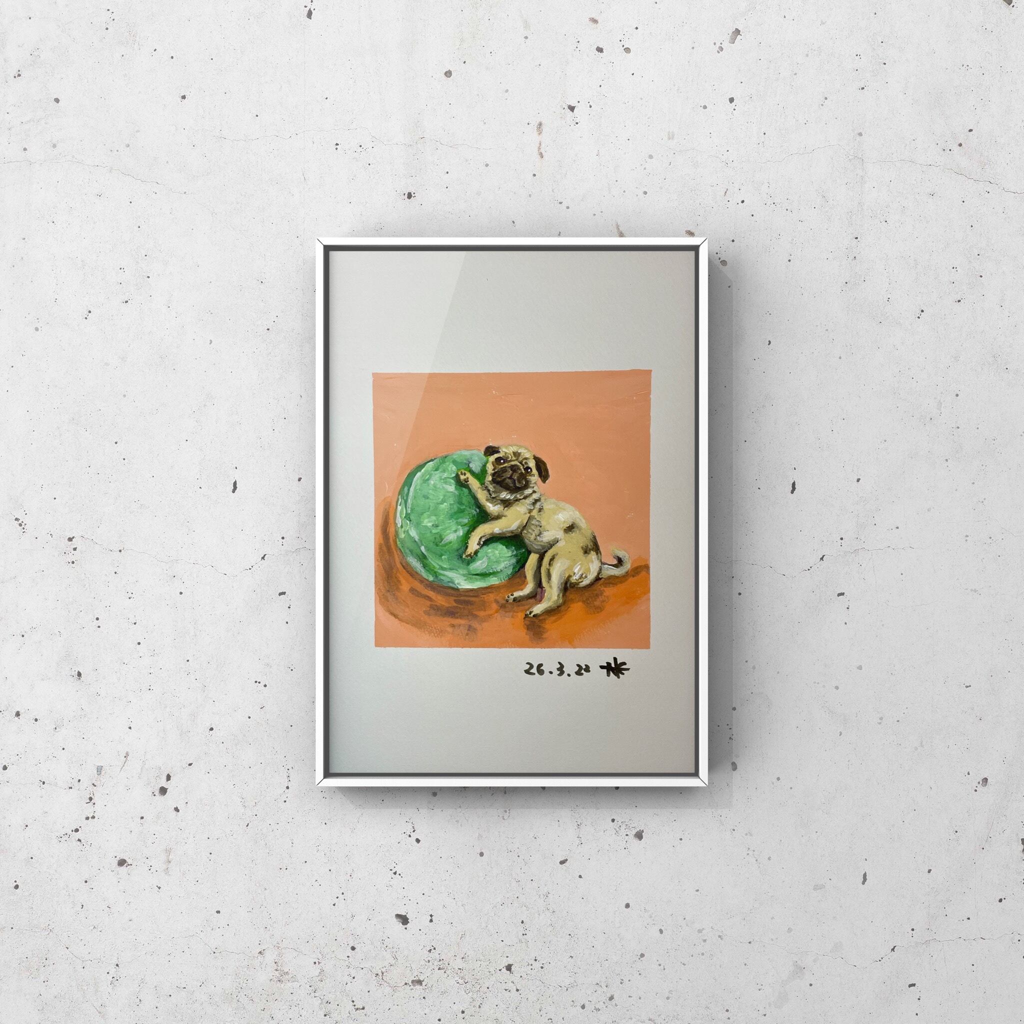 やわらかなクッションに身をあずけ、くつろぐパグの姿をアクリル絵の具で描きました。