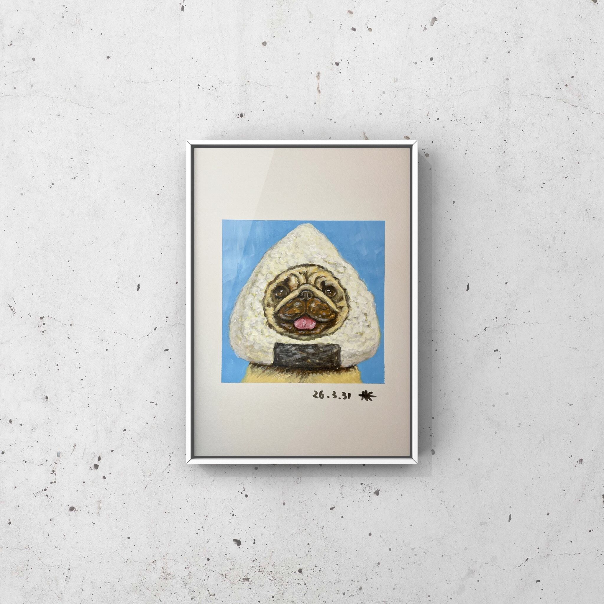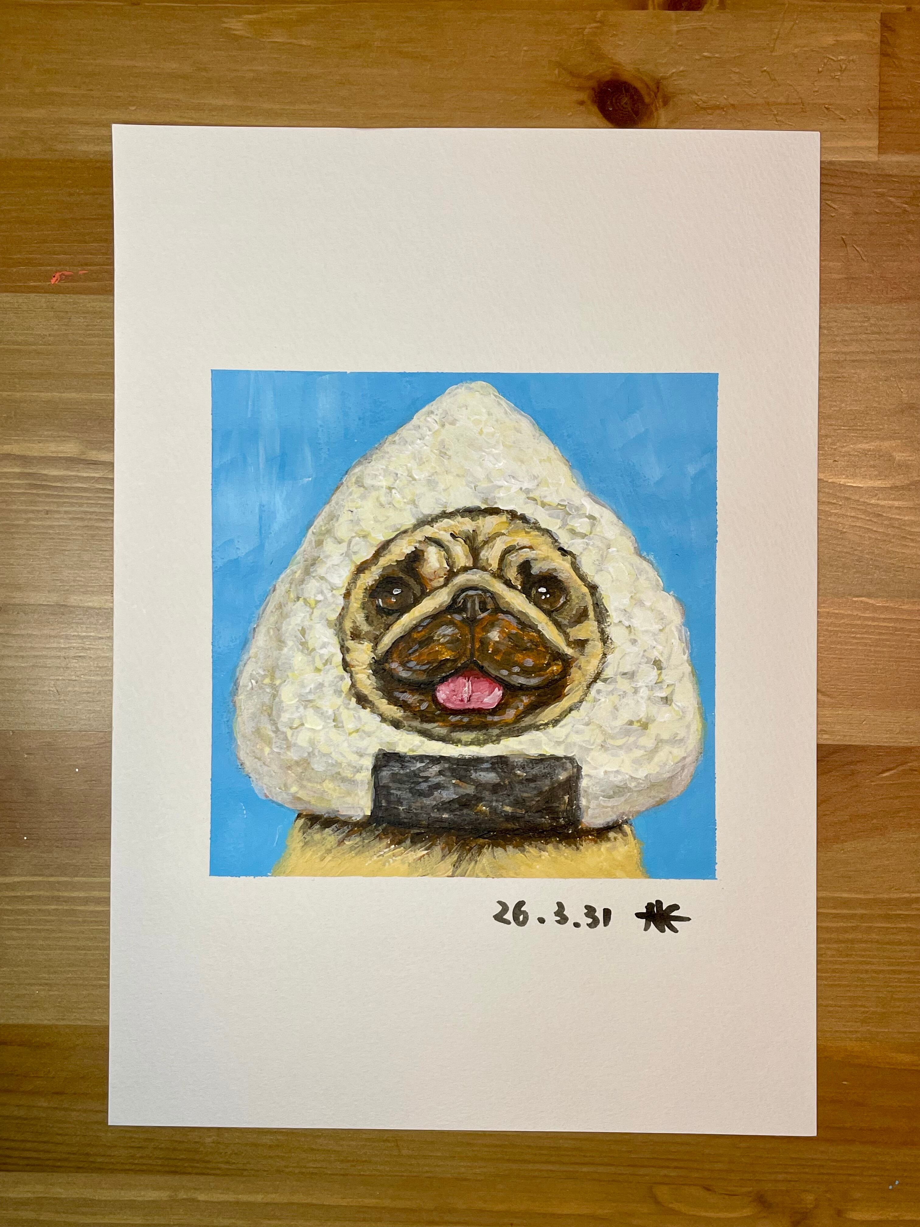 ふんわりとしたおにぎりにすっぽり包まれた、愛らしいパグをアクリル絵の具で描きました。